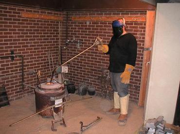 This is the instructor measuring the temperature. We poured the molten bronze somewhere around 1950°F Note the sluge on the wall even with the guy's right thigh. It will be referenced a couple of sildes from now. Those are ingots of aluminum in the lower right corner.