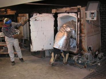 The instructor dives into the 1000°F kiln to retrieve the plaster shells. The woman on the left opens and closes the door as necessary.