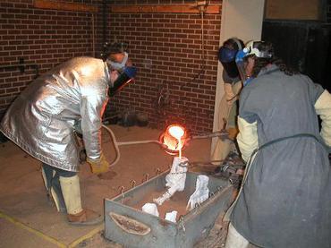 Here the molten bronze is poured into the plaster molds. I had a great vantage point. I got to watch the bronze fill the molds.